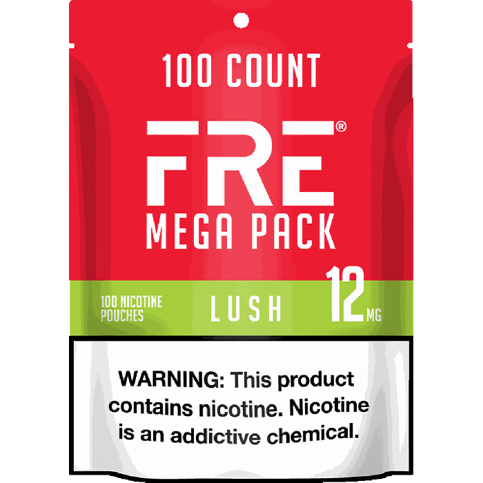 The FRE Lush 12mg Mega Pack contains 100 fruity nicotine pouches, each delivering 12mg of tobacco-free synthetic nicotine with Pre-Primed Moisture technology for optimal nicotine release.