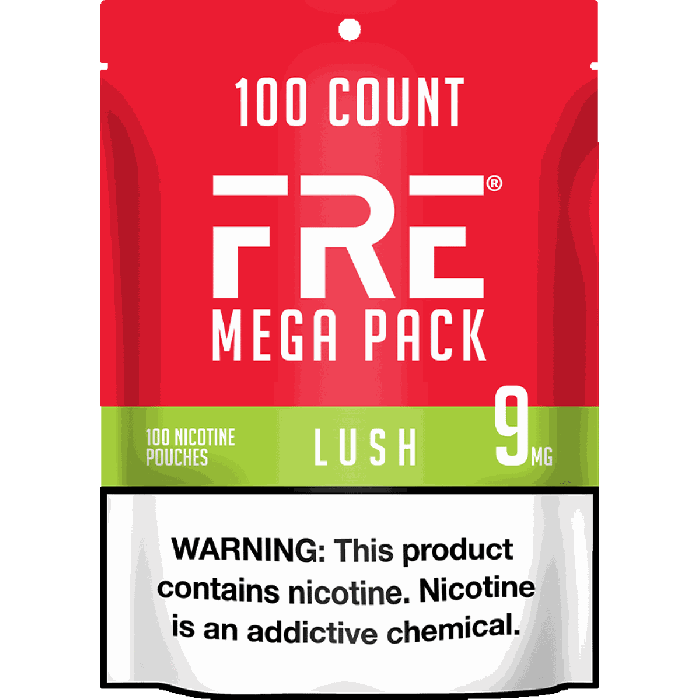 The FRE Lush 9mg Mega Pack contains 100 fruity nicotine pouches, each delivering 9mg of tobacco-free synthetic nicotine with Pre-Primed Moisture technology for optimal nicotine release.