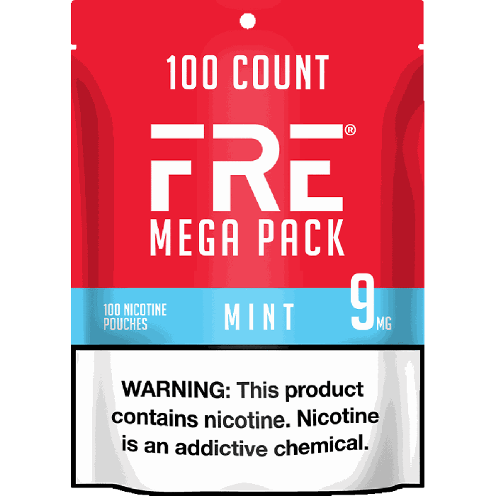 The FRE Mint 9mg Mega Pack contains 100 minty nicotine pouches, each delivering 9mg of tobacco-free synthetic nicotine with Pre-Primed Moisture technology for optimal nicotine release.