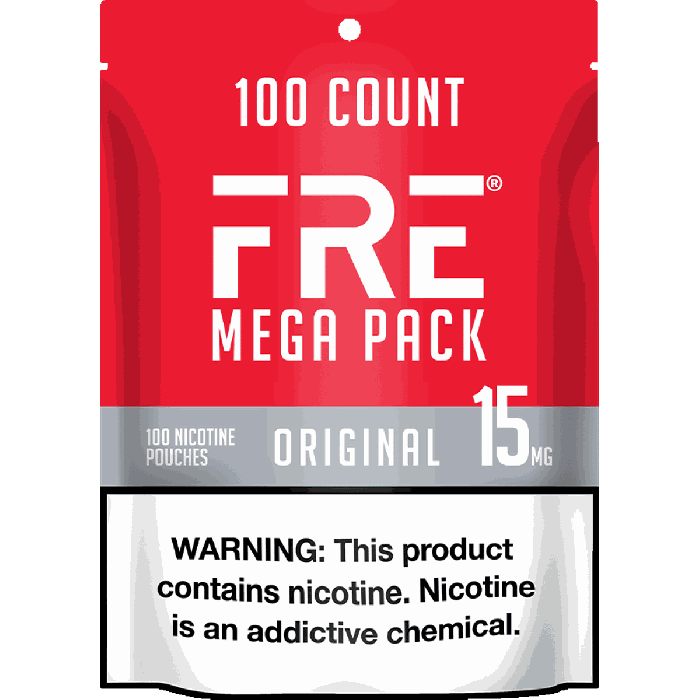 The FRE Original 15mg Mega Pack contains 100 flavor-free nicotine pouches, each delivering 15mg of tobacco-free synthetic nicotine with Pre-Primed Moisture technology for optimal nicotine release.