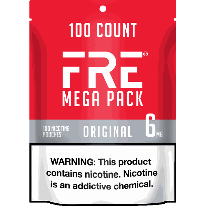 The FRE Original 6mg Mega Pack contains 100 flavor-free nicotine pouches, each delivering 6mg of tobacco-free synthetic nicotine with Pre-Primed Moisture technology for optimal nicotine release.