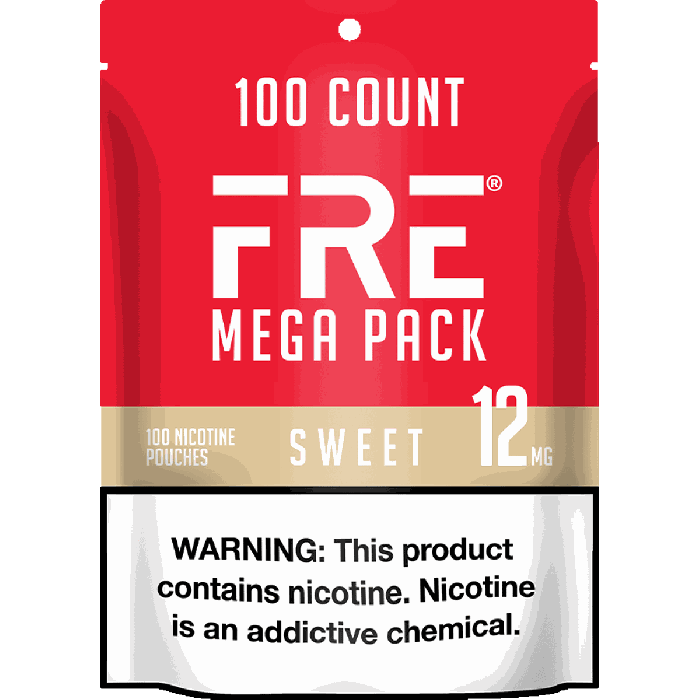 The FRE Sweet 12mg Mega Pack contains 100 unflavored nicotine pouches, each delivering 12mg of tobacco-free synthetic nicotine with Pre-Primed Moisture technology for optimal nicotine release.