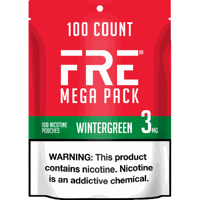 The FRE Wintergreen 3mg Mega Pack contains 100 wintergreen nicotine pouches, each delivering 3mg of tobacco-free synthetic nicotine with Pre-Primed Moisture technology for optimal nicotine release.