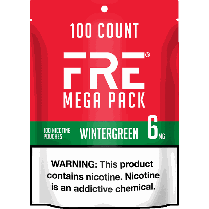 The FRE Wintergreen 6mg Mega Pack contains 100 wintergreen nicotine pouches, each delivering 6mg of tobacco-free synthetic nicotine with Pre-Primed Moisture technology for optimal nicotine release.