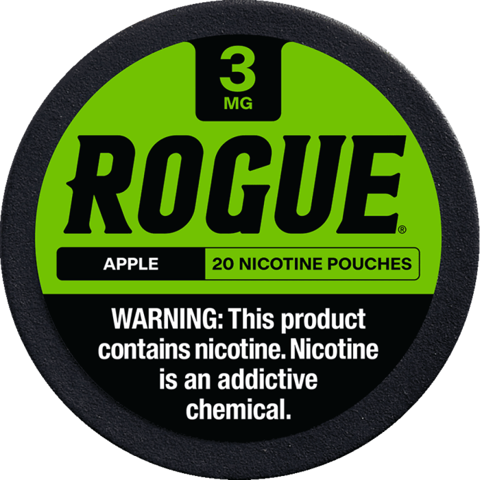 Rogue Apple 3mg is an all-American nicotine pouch featuring the taste of green apple. These all-white slim pouches are made without tobacco leaves, providing a tobacco leaf-free nicotine experience. With a nicotine strength of 3mg per pouch, they are classified as less intense strength. For those who prefer a stronger option, a 6mg strength is also available.